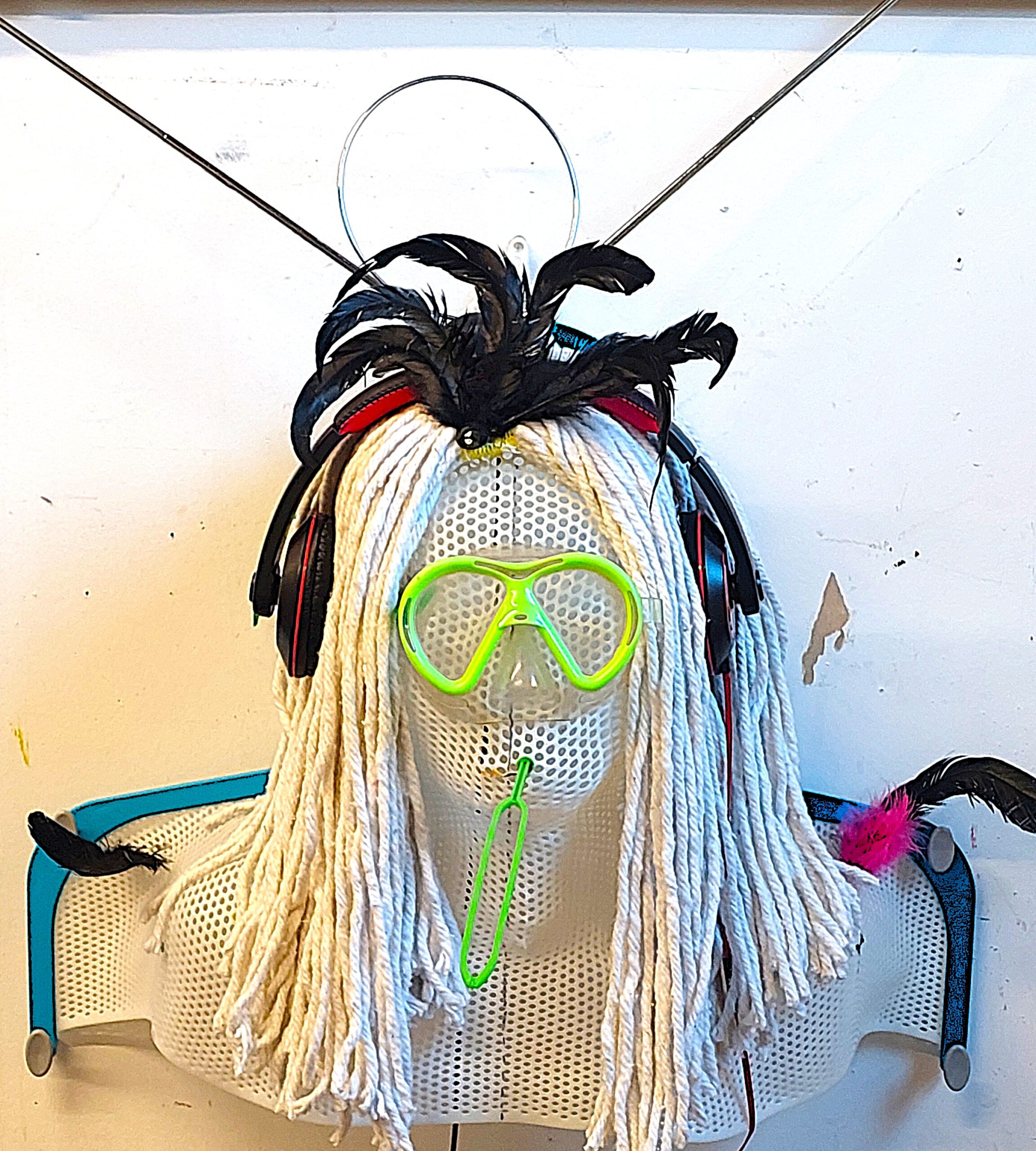Materials: Radiation therapy thermoplastic mask, mop head, swimming goggles, headphones, bubble wand, TV antenna, feathers;